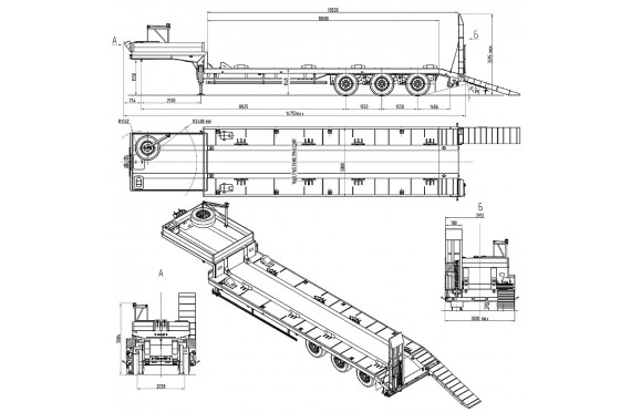 45200 кг, шины 395/85R20 или 445/65R22,5 / 6+1, платформа 12000 (12862 до трапов) x 2530 с уширителями до 3030 мм, ССУ 1550 мм, рессорная или пневматическая подвеска, съемные стойки, механические трапы с пружиной