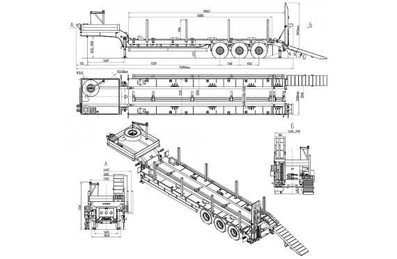 45000 кг, шины 395/85R20 или 445/65R22,5 / 6+1, платформа 10000 (10862 до трапов) x 2530 с уширителями до 3030 мм, ССУ 1532-1550 мм, рессорная или пневматическая подвеска, раздвижные коники